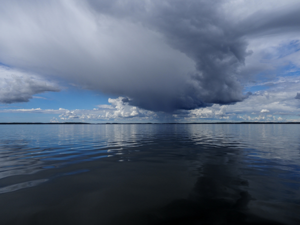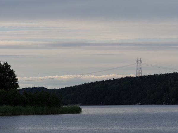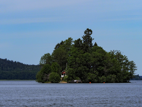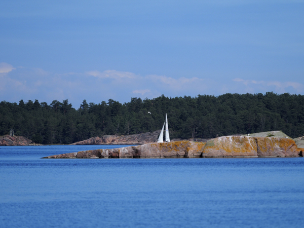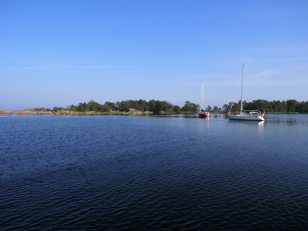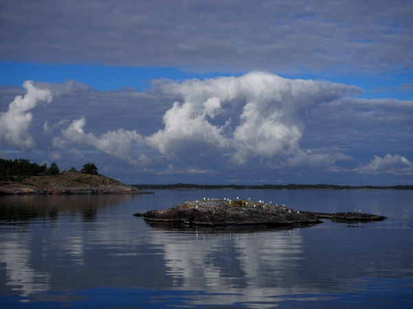 In der letzten Nacht noch ein schönes Gewitter, aber ohne Wind. Das macht sich am Morgen bezahlt: Spiegelglatte See. Da reichen 4 m/s aus West, und das Bootchen rennt mit 6 kn los - leider nur bis auf Höhe Sandhamn, und dann dreht der Wind allmählich auf Nord. Kreuzen! Das geht aber in dem glatten Wasser. Und es wird langsam richtig warm, sogar für T-Shirts reicht das.