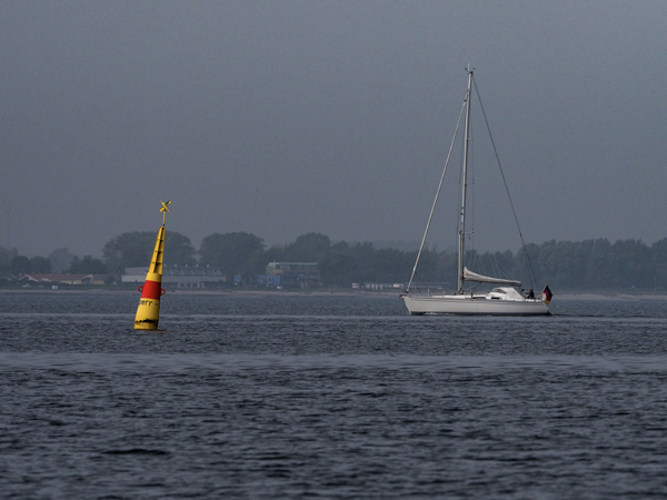 Extrem schlechte Sicht heute, ganz wenig Wind. Wir schleichen nach Schlei(ch)münde. Wir sind nämlich noch gar nicht zu Hause. Glücklicherweise kommt der Wind fast halb, so dass wir einigermaßen Fahrt machen. Im Sperrgebiet Schönhagen dann ein freundlicher Anruf von einem freundlichen Minenjagdboot: "Wir wollen jetzt da hin und üben. Ihr müsst da bitte weg." Machen wir, und treiben mit Nordstrom haarscharf an der Sperrgebietstonne vorbei.