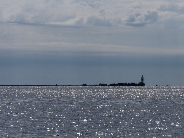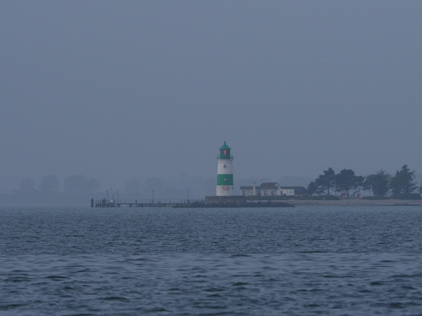 Spät kommt das Bauklötzchenkonglomerat von Olpenitz in Sicht und der Leuchtturm Schleimünde. Der hat doch tatsächlich Licht an, so unsichtig ist das.