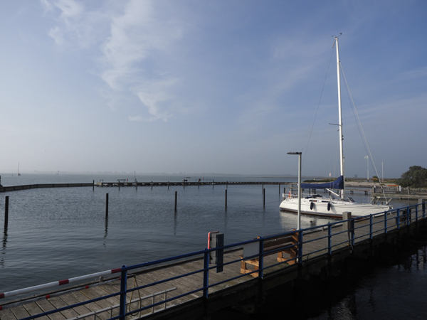 So, kleiner Landurlaub zwischendurch. Meine alte Bürochefin ist jetzt auch in Rente, und die musste ich gebührend verabschieden. Also erst mal mit Mietwagen nach Hause und zurück. Gestern dann noch mit zwei Reffs und etwas gerollter Genua ab nach Westen, rasant Strecke gemacht. Die Sicht war absolut miserabel, die Luft tropisch feucht. Man schwitzte ohne sich zu bewegen. Mit dicker Bugwelle durch Grønsund und Smalands Fahrwasser bis Omø. Hier sind nicht mehr viele, nur etwa die Hälfte des Hafens belegt. Der Fischladen ist schon zu. Na ja, wir hatten zu Hause gut eingekauft und sind voll verproviantiert.