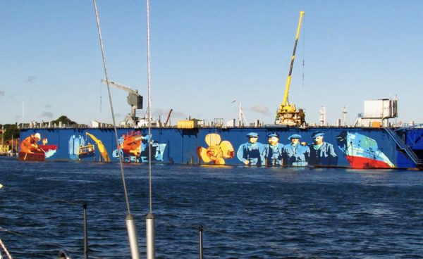 So, jetzt rein in den Hafen von Karlskrona. Viel Platz ist da an soliden Fingerstegen. Sehr guter Service im Hafen und das nicht mal teuer. Über unser Wohlergehen wacht ein komischer amphibischer Heiliger.