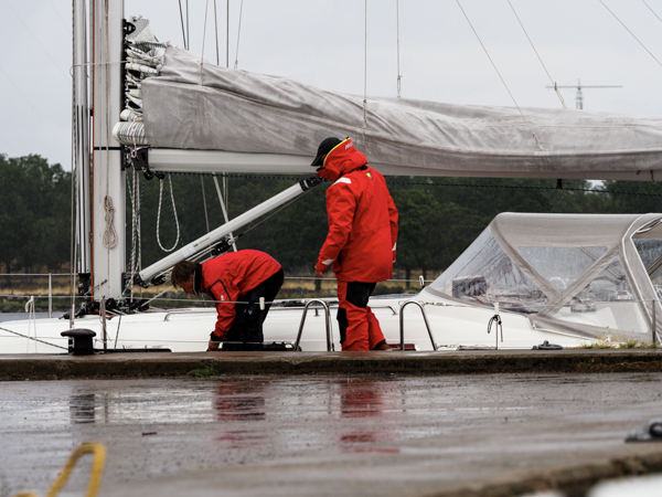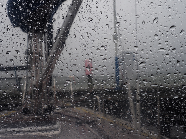 Noch geht's nur um den Endspurt beim Ausrüsten. Segel sind an Bord und angeschlagen, Schlauchboot ist verstaut, alle Klamotten an Bord (Musto Unterwäsche zuoberst). Kalt ist es, und es regnet. Aber jetzt noch die ganzen Lebensmittel!
