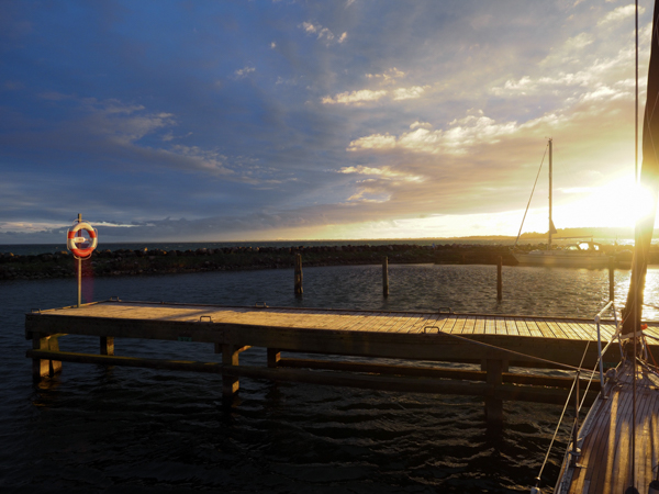 Bei strahlender Sonne und Rauschefahrt ging's völlig von der Großschiffahrt unbehelligt über das VTG. Viel zu früh waren wir bei der Einfahrt nach Gedser. Also weiter nach Hesnaes. Das lief bestens, aber im Süden bezog sich der Himmel. Wird das was? Nee, zog vorbei. Und dann, 3 Meilen vor Hesnaes kachelt es plötzlich los: 10 m/s, 12, 13, 14! Und das auch noch aus Süd! Nee, das ist ja nun gar nichts für Hesnaes. Großsegel geborgen, und unter Genua alleine in irrer Fahrt nach Klintholm. Da dann noch ein paar Regenschauerchen mitgenommen vor dem Anlegen, und - puuh! Hier sind wir fest, und jetzt gibt es lecker Abendessen: Lammlachse mit Gorgonzolanudeln und Zucchinigemüse.
