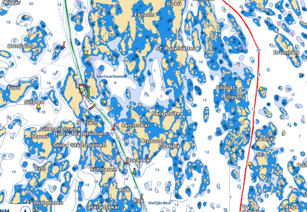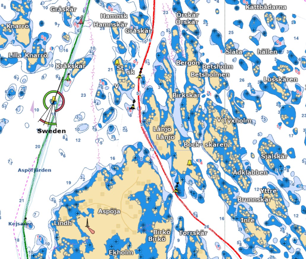 Die eingezeichnete grüne Route ist das Hauptfahrwasser im Aspöfjärden, die östlichere rote Route ist der Kronleden. Das Wasser dort ist tief und rein und ohne Überraschungen. Die Orientierung fällt anhand der zahlreichen Baken an Land leicht.