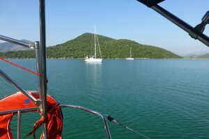 Die mittlere Bucht wird mit einer Tiefe von 18 Metern angegeben. Mit Hilfe einer Landleine bietet diese Bucht bestimmt eine sehr schöne Übernachtungsmöglichkeit. Wir sahen eine Yacht mit Landleine im angenehmen Schatten der Bäume liegen. Wir übernachteten in der letzten Bucht.[1]