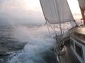 Am Cabo Formentor angekommen, war die Vorfreude auf den Törn einfach schon so groß, dass Abdrehen nach Südwesten eigentlich nicht mehr in Frage kam: Das Ziel hieß Barcelona. Der Wind kam backstags, ich hatte die Genua und das Groß voll gesetzt, der Besan blieb herunten, war mir einfach zuviel Arbeit und hätte auf diesem Kurs eh' nichts gebracht. Zum Abend hin war der Wind dann auf 5-6 Bft. aufgefrischt, meine alte SUNNY BOY lief mit 7,5 bis 8kn, war ziemlich luvgierig und inzwischen eindeutig übertakelt. Ein Langkieler mit 15 to ist schließlich kein Racer/Cruiser und ich war ja allein unterwegs. Also Genua einrollen, Aufschießer mit Maschinenunterstützung und Autopilot, mit Safetyharness am Jackstay aufs Deck und das Gross ins dritte Reff eingebunden. Alles noch ehrliche Handarbeit - bei 2-3m Seegang! (nicht dass ich da stolz drauf wäre – ein hydraulisches Rollgroß wäre mir auch lieber, aber das nötige Kleingeld fehlt halt leider!) So hatte ich für die Nacht meine Ruhe und 6,5kn waren immer noch drin.