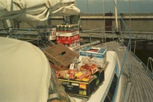 Das Einkaufen für Törns ist immer ein Erlebnis. Diesmal, für 6 Personen und 3 Wochen: fünf Einkaufswagen voll, unter anderem: 6 Paletten Cola-Light, 4 Paletten Cola, 2 Paletten Dosenbier. Insgesamt 605 Euro bezahlt. Eigentlich hätte man doch wenigstens ein paar persönliche Dankesworte vom Filialleiter erwarten dürfen, oder? Zumindest wurde eigens für uns eine eigene Kasse aufgemacht...