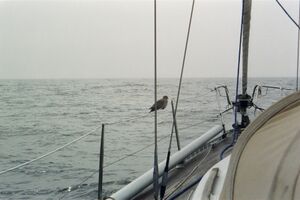 Taube: Sitzt jetzt auf der Sprayhood, nachdem sie zuvor ganz vorne am Bugkorb saß - um zu verhindern, dass sie durch eine Welle weggerissen wird, haben wir versucht sie einzufangen, woraufhin sie auf die Sprayhood geflogen ist.