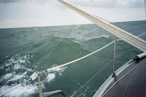 Wetter: Die Wellen sind ruppig - zwar nicht hoch (max. vielleicht 1-2m), aber kurz und steil von achtern. Schaukelt gut und macht Spaß!