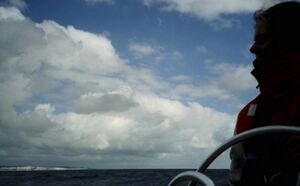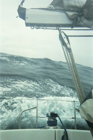 0200: Wir liegen bei. Keine Chance, bei dem Wind sinnvoll Strecke zu machen. Als ich zu meiner Wache an Deck gehe, erwartet mich vergleichsweise warmer, aber durchgängiger Wind, Nieselregen und Dunkelheit. Irgendwie unheimlich sind die Gischtkämme auf den Wellen um uns herum. Man kann nur die Gischt erkennen, ansonsten ist es absolut dunkel, die Wellen lassen sich nur erahnen. Mittlerweile liegt die Windgeschwindigkeit bei 30-40 kn, also 7-8 Bft. Das Schiff liegt im 3ten Reff und ohne Genua bei. Laut GPS treibt es mit 1.5 kn, an Backbord ist der leuchtende Teppich unseres Kielwassers auszumachen.